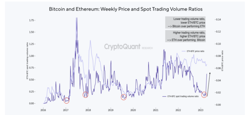Bitcoin has demonstrated a more robust performance compared to ETH, with a 14% lead in 2023. This has been evidenced by the ETH/BTC price declining to the lowest point since July 2022. Nevertheless, there is a possibility that ETH may outperform BTC in the near future for two key reasons. Firstly, the relative spot demand for ETH has increased recently due to a decrease in BTC spot trading volume, following the suspension of zero-fee trading for most of its BTC trading pairs by Binance in March. Secondly, futures markets are indicating a potential shift towards ETH, with the open interest and trading volume possibly bottoming out. The uptick in ETH-BTC relative spot trading volume has been driven by the substantial decline in Bitcoin’s spot trading volume following the suspension of zero-fee trading by Binance. Additionally, there are indications that ETH will outperform BTC in futures markets. The ETH-BTC open interest ratio appears to have bottomed out before the Shanghai upgrade on April 12, indicating relatively higher demand for ETH than BTC. Furthermore, the perpetual futures market trading volume also shows that the ETH-BTC relative volume may have reached its lowest point, which could support an increase in ETH’s price in the future. However, it is important to note that ETH is still experiencing a downward trend against BTC from a valuation perspective, as the ETH/BTC MVRV ratio remains below its 365-day moving average.